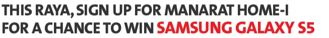 From 23 June 2014 to 31 August 2014, celebrate the chance to grab a Samsung Galaxy S5 when you sign up for Manarat Home-i with a minimum financing amount of RM100,000. Apply now! |