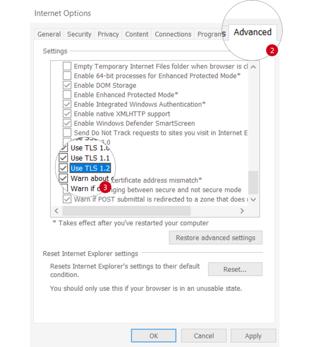 Under “Internet Options”, select “Advanced” tab